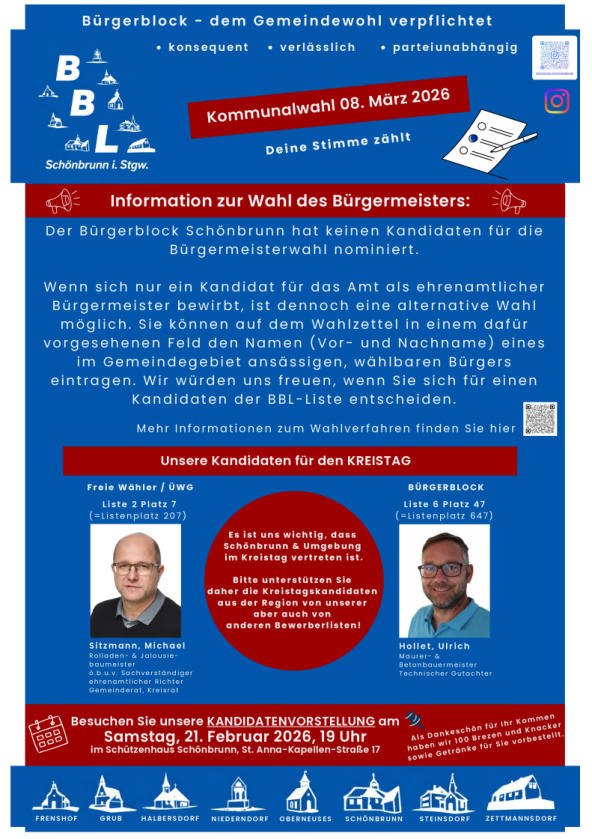 Mitglied des Gemeinderates der Gemeinde Schönbrunn i. Stgw. (BBL = Bürgerblock)